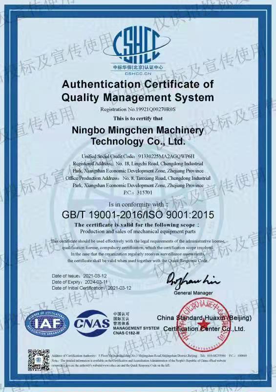 Ningbo Mingchen Machinery Technology Co., Ltd., founded in January 2018, is located at No. 8, Tanxiang Road, East Industrial Park, Xiangshan City, Ningbo, Zhejiang Province. It covers an area of 18 mu, with a construction area of 10000 square meters, convenient transportation and beautiful environment.